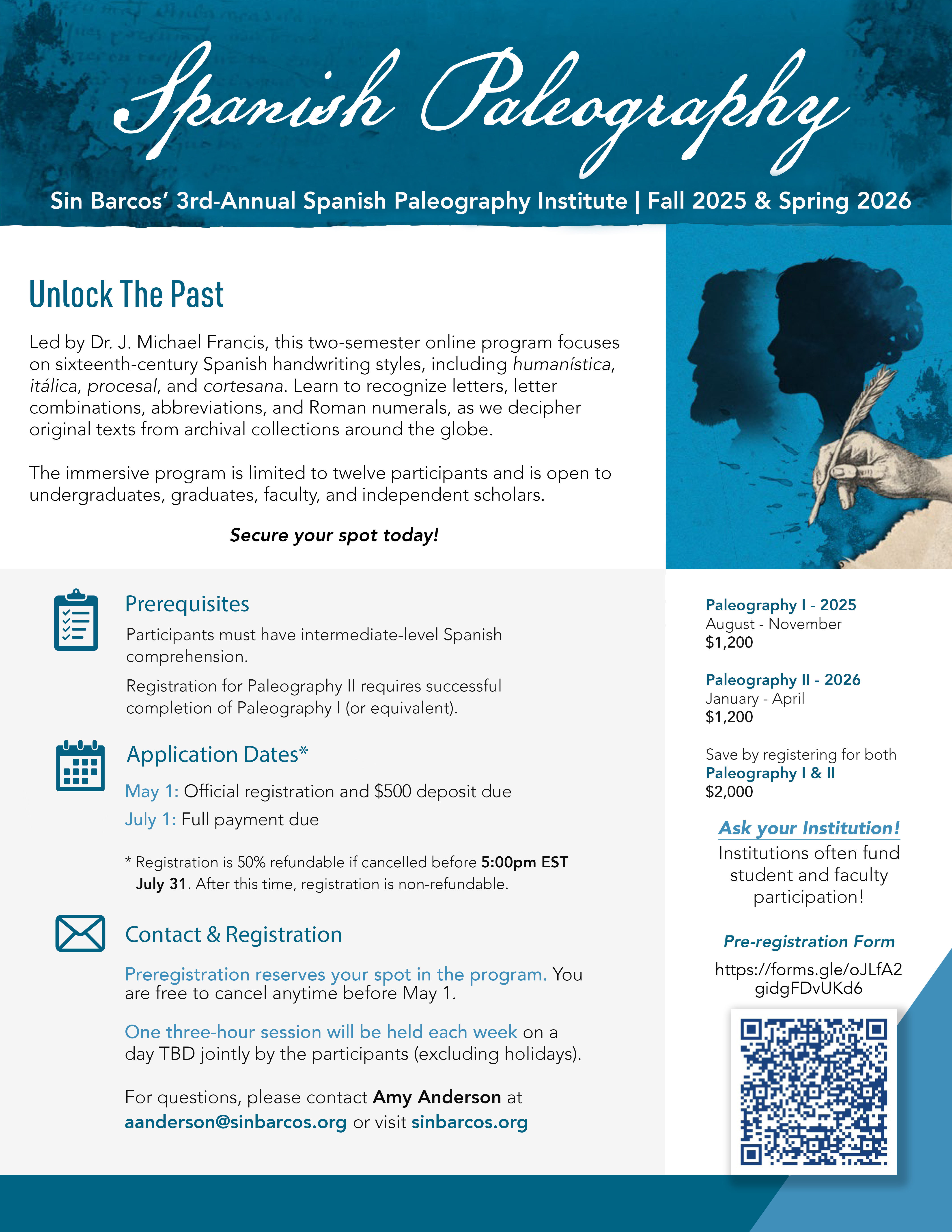 *Paleography I Fall 2025 is currently full. Contact info@sinbarcos.org for information about Paleography II Spring 2026 or future workshops.